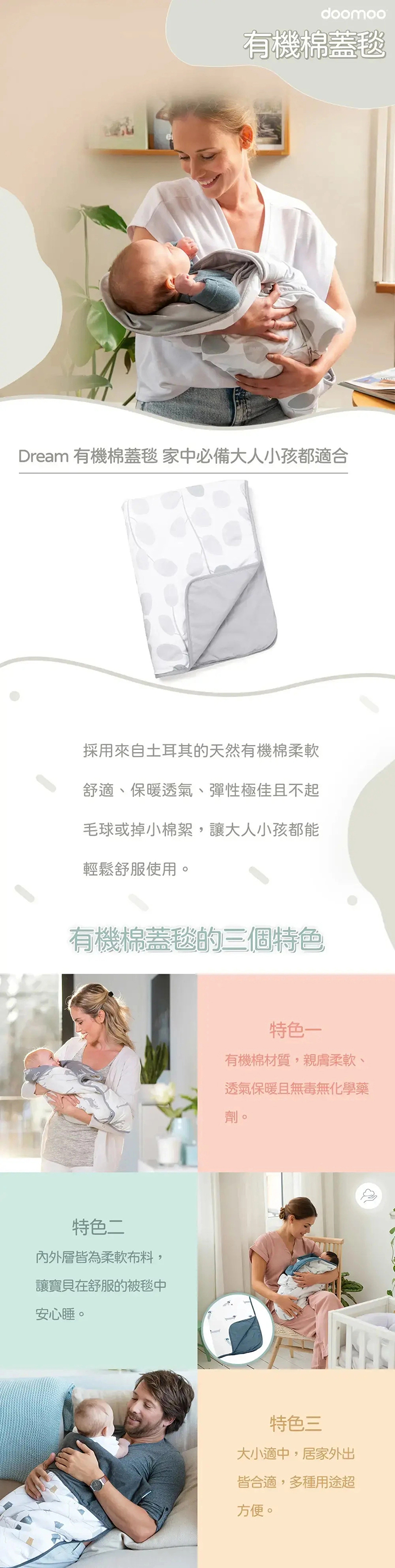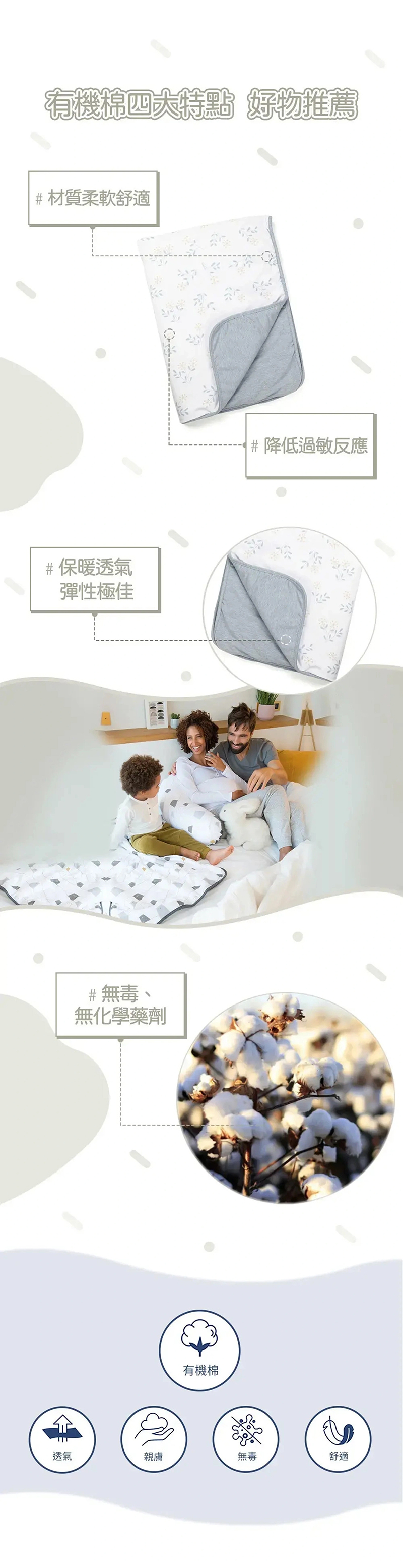 有機棉蓋毯,材質柔軟,輕鬆包覆寶貝身體,透氣保暖兼具
