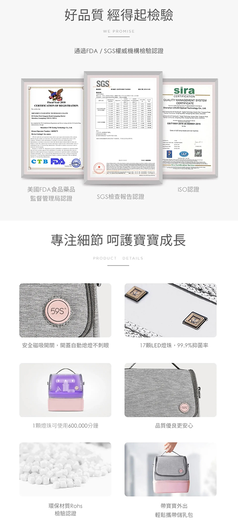 內容物:消毒包、USB線、肩揹帶、說明書、抑菌報告、專用電池