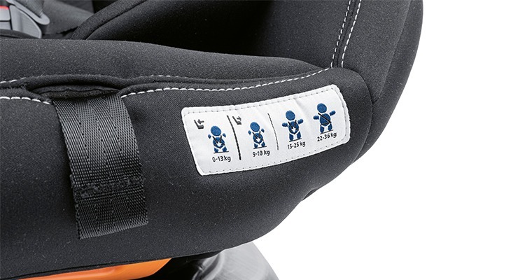 新生兒軟墊及汽座本體布套上,將每一區間適用的寶寶乘坐體重,以布標清楚標示,方便不同照護者(爸媽/爺奶/保母/朋友等)辨識。