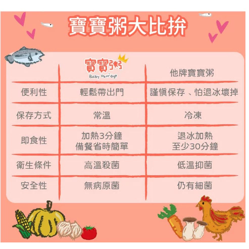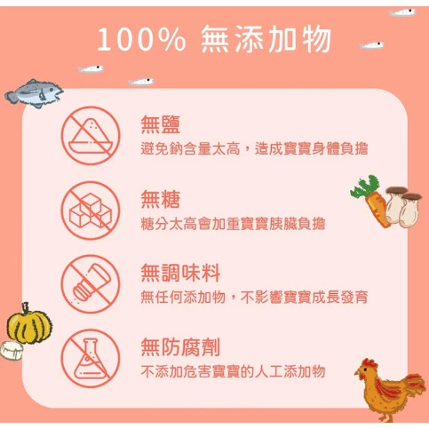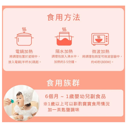 成份:水、有機米、紅蘿蔔、洋蔥、青花菜、吻仔魚、海灣貝柱;白米無使用農藥及化學肥料