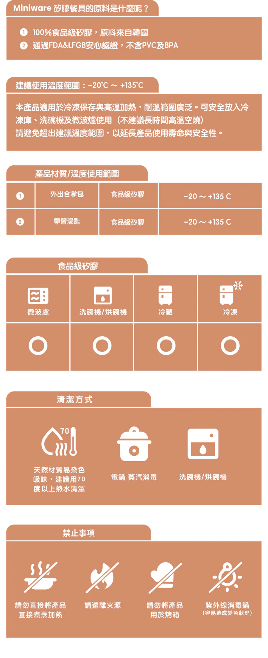 內容物:Miniware 圓滾學習湯匙 x1 Miniware 合掌包外出矽膠盒 x1