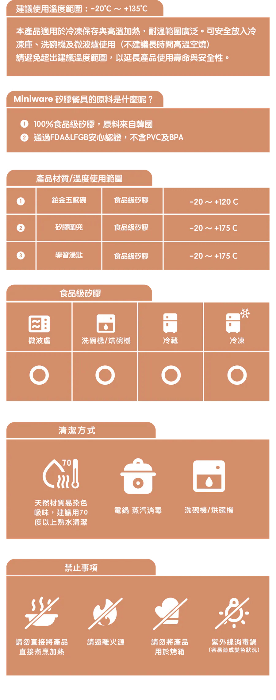 材質 : 食品級矽膠 (建議使用溫度):-20 ~ +135度