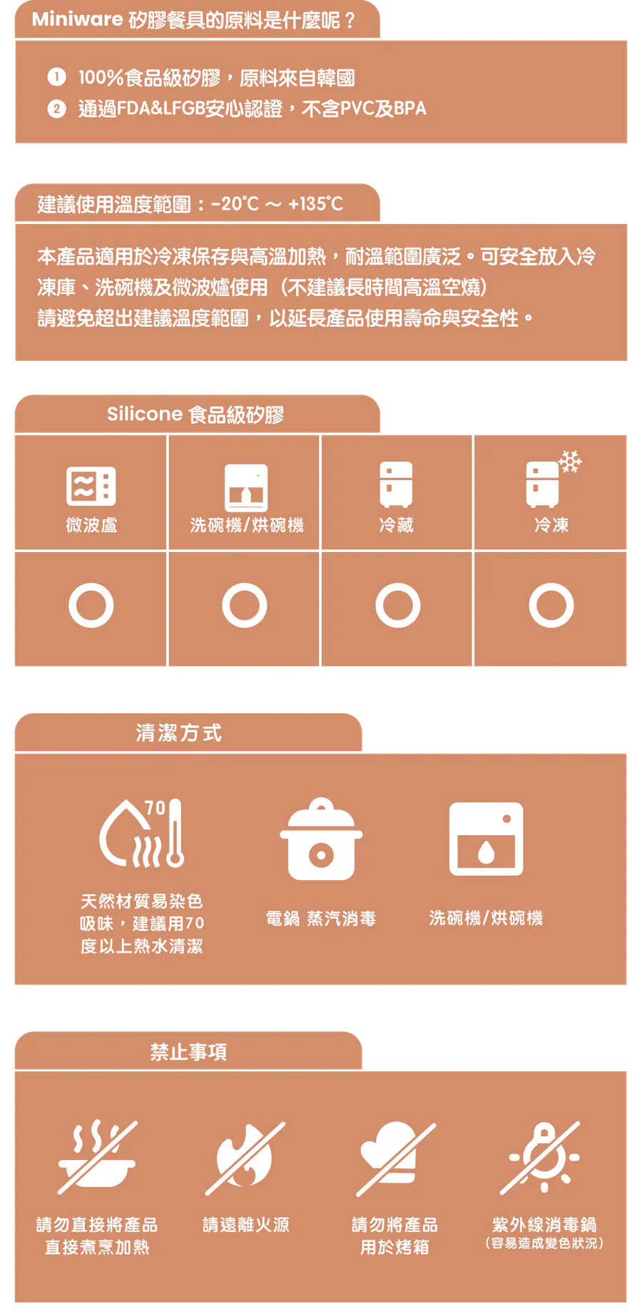 材質:建議使用溫度範圍:-20 ~ 135 度 (食品級矽膠:-20 ~ +175度)
