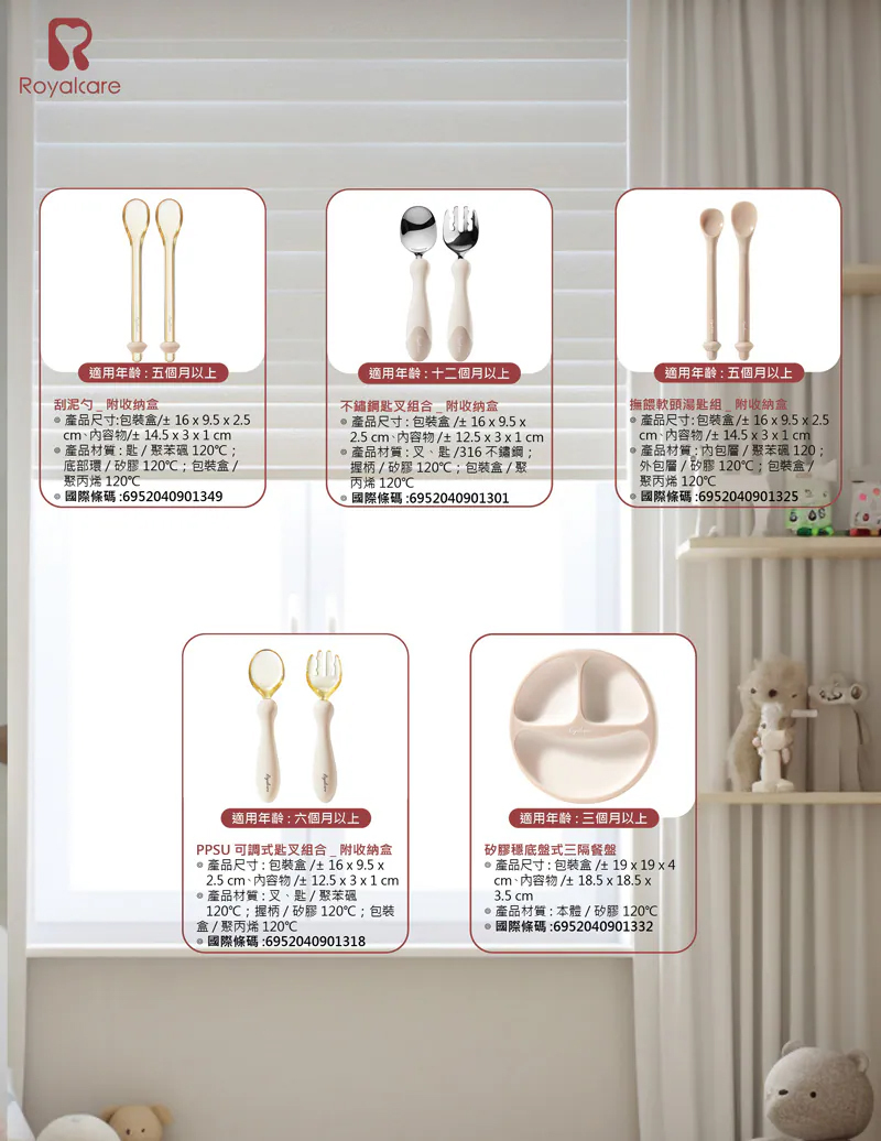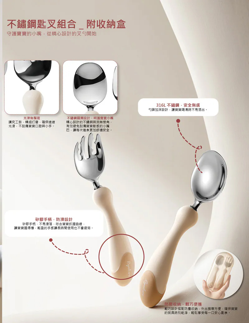 材質:叉、匙/聚苯碸120℃;握柄/矽膠120℃;包裝盒/聚丙烯120℃