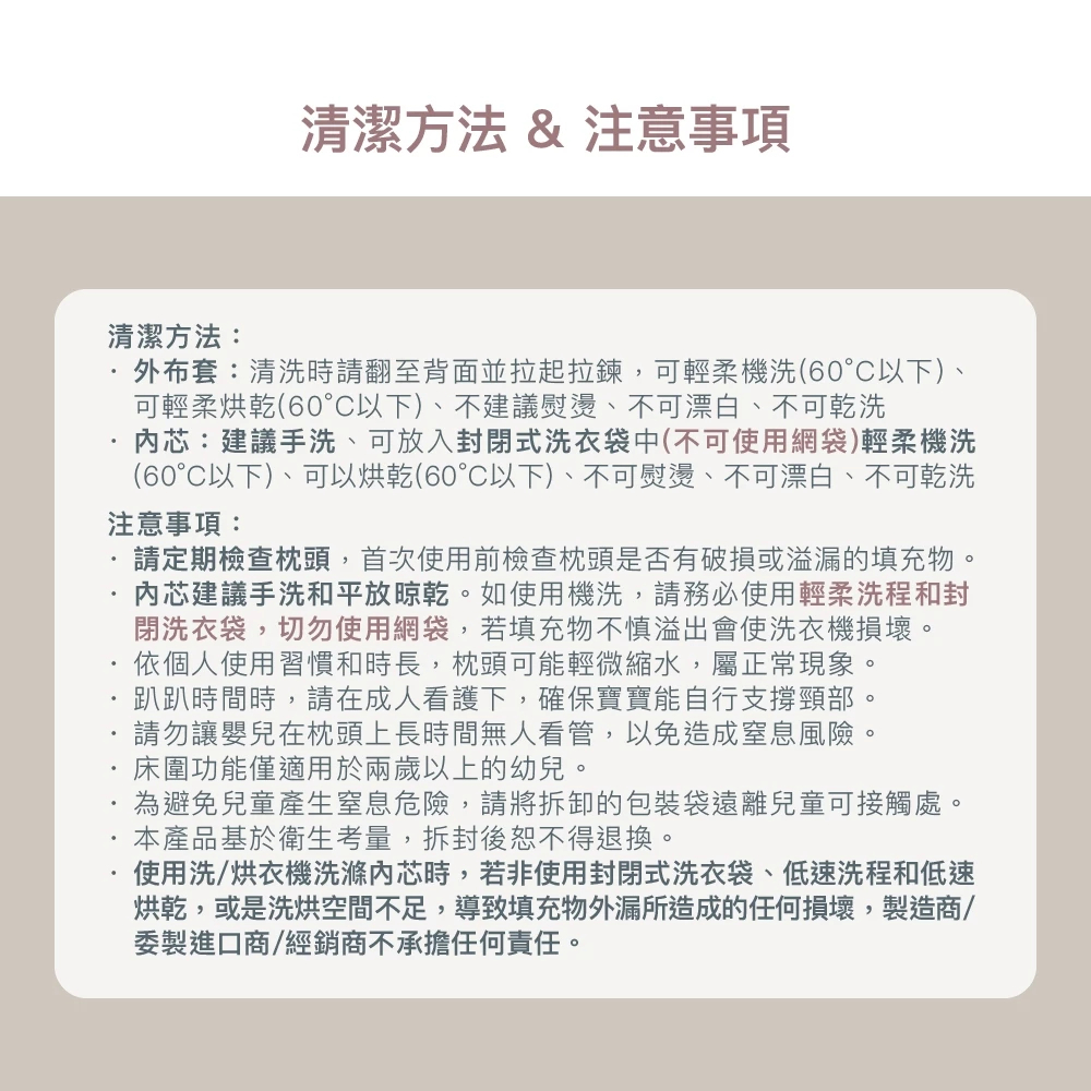 1. 外布套:清洗時請翻至背面並拉起拉鍊,可輕柔機洗(60°C以下)、可輕柔烘乾(60°C以下)、不建議熨燙、不可漂白、不可乾洗