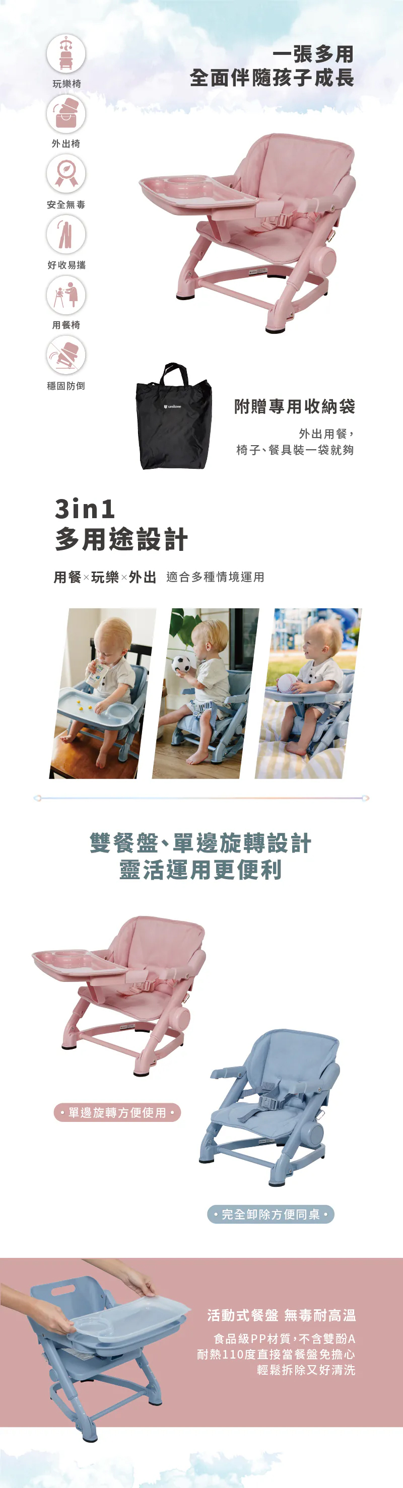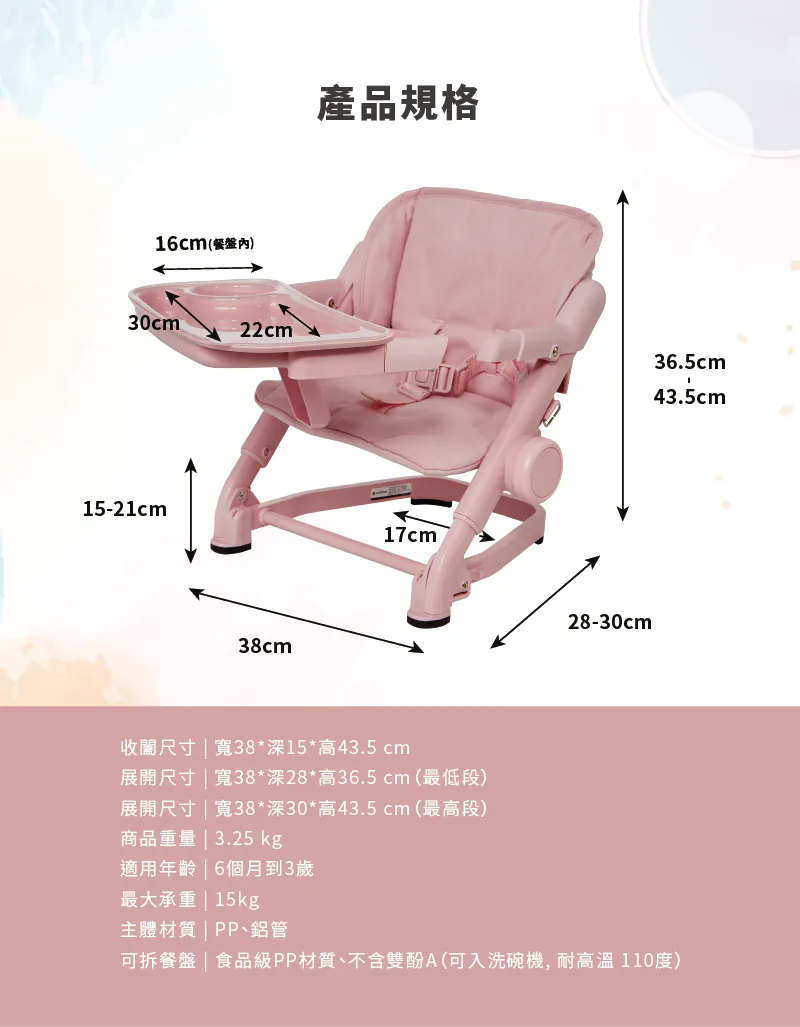 商品內含:座椅x1、透明托盤x1、收納袋x1、說明書x1