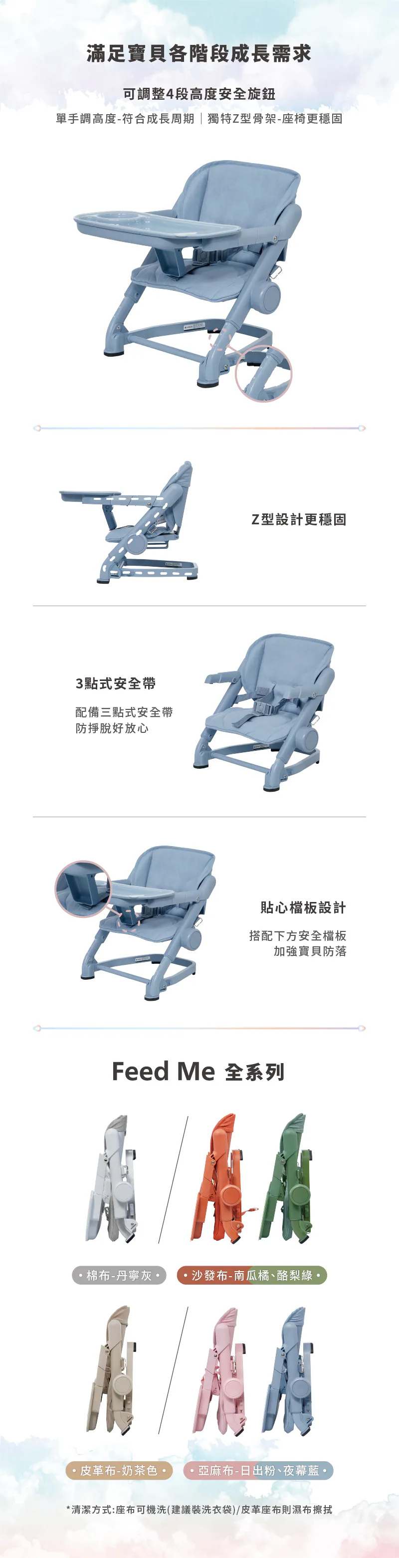餐椅上半部座椅處可水洗,下半部骨架支撐處建議使用濕布擦拭即可